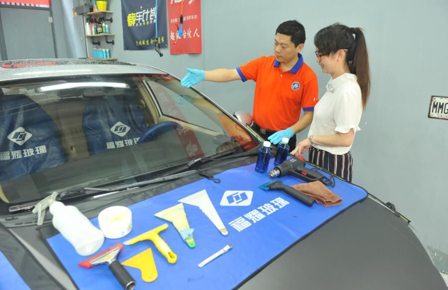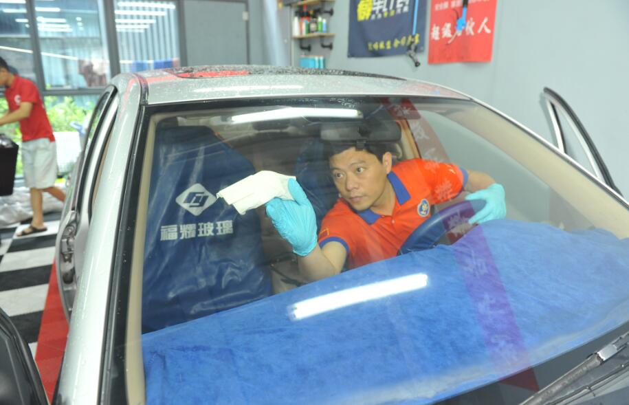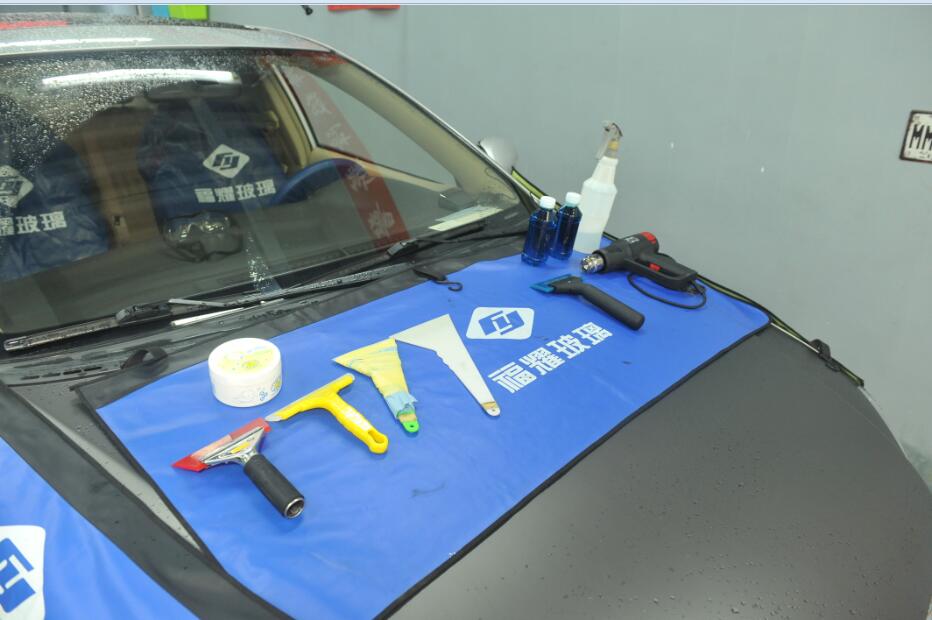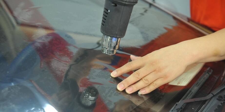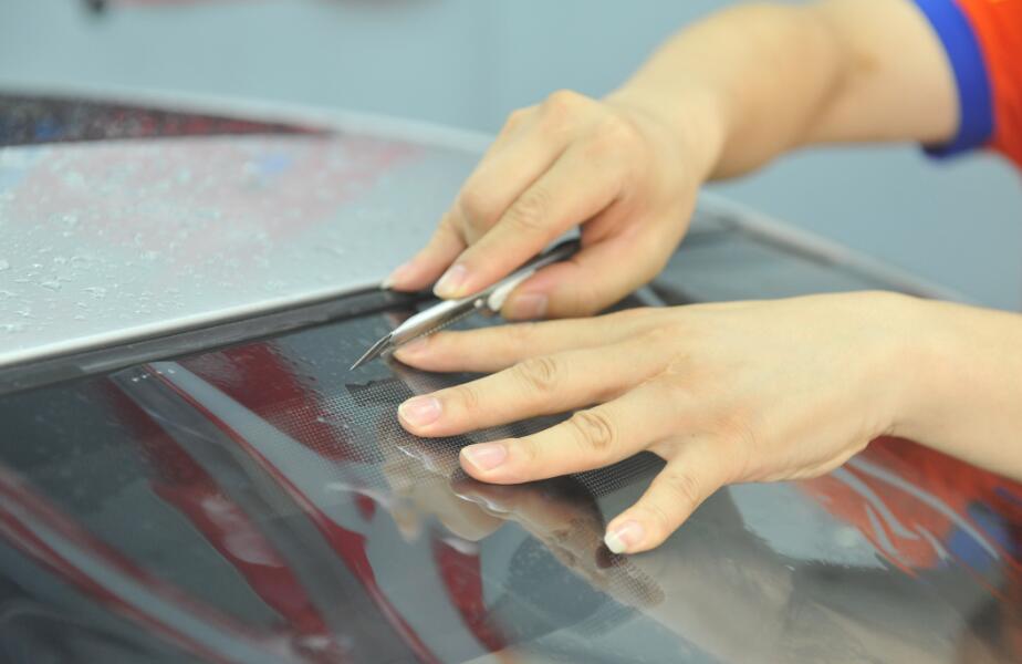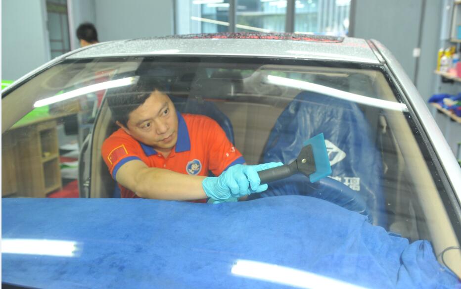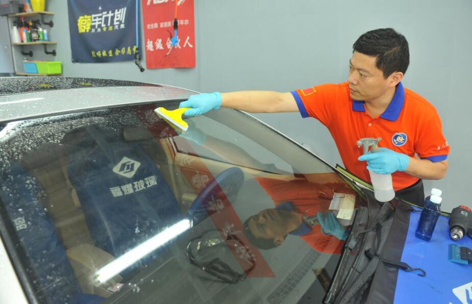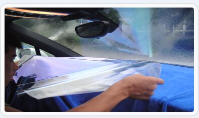玻璃內側清潔后將膜裝貼到車窗玻璃上